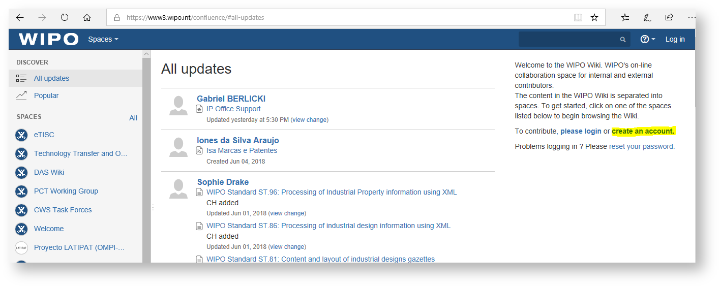 Go to: https://confluence.wipo.int/confluence/ and click on “Create an account”